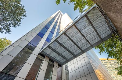 Tekst: Pont de liaison galvanisé situé au-dessus de l'entrée du parking souterrain de la tour Victoria (Regina) à Bruxelles. Ce pont, qui fait partie de la grande rénovation de la tour, assure la liaison et sert de voie d'évacuation vers le parc voisin. Le constructeur métallique été chargé de la réalisation complète de ce pont, depuis le relevé des mesures jusqu'au montage, en passant par la structure et la finition du pont, des garde-corps et de l'escalier. Victoria est un bâtiment emblématique, construit entre 1974 et 1978, qui servait de siège belge à IBM dans le quartier nord de Bruxelles. Son architecture iconique, étroitement liée à la marque IBM, est considérée comme une valeur archétypale et sert donc de point de départ pour le développement futur. Le projet de rénovation vise à transformer la structure existante en un bâtiment hybride, sans énergie fossile et à faible consommation d'énergie, en maximisant la réutilisation des matériaux de construction. La structure en béton et en acier est donc considérée comme un élément permanent pour les changements futurs.