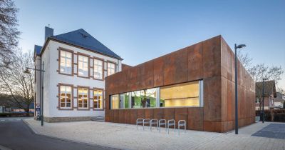 Tekst: Le bâtiment classé de la Machine-à-eau est conservé au sein d’un complexe ambitieux autour duquel deux extensions contemporaines complètent le bâtiment historique, l’englobant dans un ensemble porteur de sens de sa nouvelle fonction. L’acier se retrouve dans la passerelle de 16 m de long, une tôle pliée de 10 mm dans l’esprit des origamis, qui caractérise de nombreux éléments de la ferronnerie mais qui imprègne aussi les nouvelles façades qui donnent volontiers l’impression d’une surface pliée plutôt que d’une masse. Le mobilier aussi recourt abondamment à l’acier.