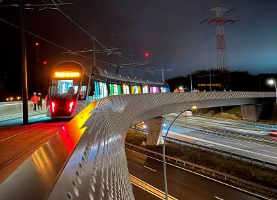 Tekst: L’ouvrage OA894 constitue un pont de franchissement majeur au-dessus de l’autoroute A1 dans le cadre du prolongement de la ligne n°1 du tramway luxembourgeois vers l’aéroport du Findel. Il s’agit d’un ouvrage mixte acier-béton, composé de deux travées hyperstatiques de 45 m et 63 m, pour une portée totale de 108 m. L’implantation répond à des exigences fortes en matière de fonctionnalité ferroviaire, de contraintes autoroutières et d’intégration dans l’environnement. Le tablier supporte deux voies de tramway ainsi que deux pistes de service, présentant une largeur utile totale de 7,27 m. L’ouvrage OA894 incarne un exemple remarquable de synergie entre ingénierie structurelle avancée et design architectural intégré. Sa charpente métallique fermée assure une robustesse optimale pour un franchissement ferroviaire en courbe, tandis que son habillage en aluminium confère à l’ensemble une légèreté visuelle et une signature contemporaine. Pensé pour durer, l’ouvrage s’inscrit avec élégance dans un environnement paysager délicat, à proximité immédiate d’une zone Natura 2000.