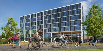 Tekst: Pour la réinstallation de la société de réseau Liander, les matières premières et les matériaux ont fait l’objet d’une application circulaire maximale. Tout ce qui était encore utilisable dans l’ancienne construction a aussi été réutilisé. Une charpente de protection ondulée en acier enjambe les cinq bâtiments existants. Les toitures existantes sont des constructions en acier très légèrement dimensionnées, avec une surcapacité très réduite. C’est pourquoi la façade est suspendue à la nouvelle toiture.