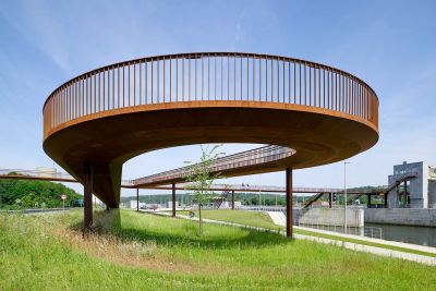 Tekst: D’une portée de 22 m pour 4 m de large, cette passerelle à Verviers s’articule autour d’un profilé reconstitué soudé (PRS) à hauteur variable qui délimite deux cheminements, un cheminement direct et une promenade en arc. Le support du platelage s’étend quant à lui en porte-à-faux de part et d’autre sur cette poutre considérée comme la colonne vertébrale de la passerelle. La torsion engendrée par des chargements dissymétriques est reprise par un arc déconstruit formé des tubes latéraux : l’un rectiligne assure le rôle de tirant et l’autre selon la forme de l’arc.
