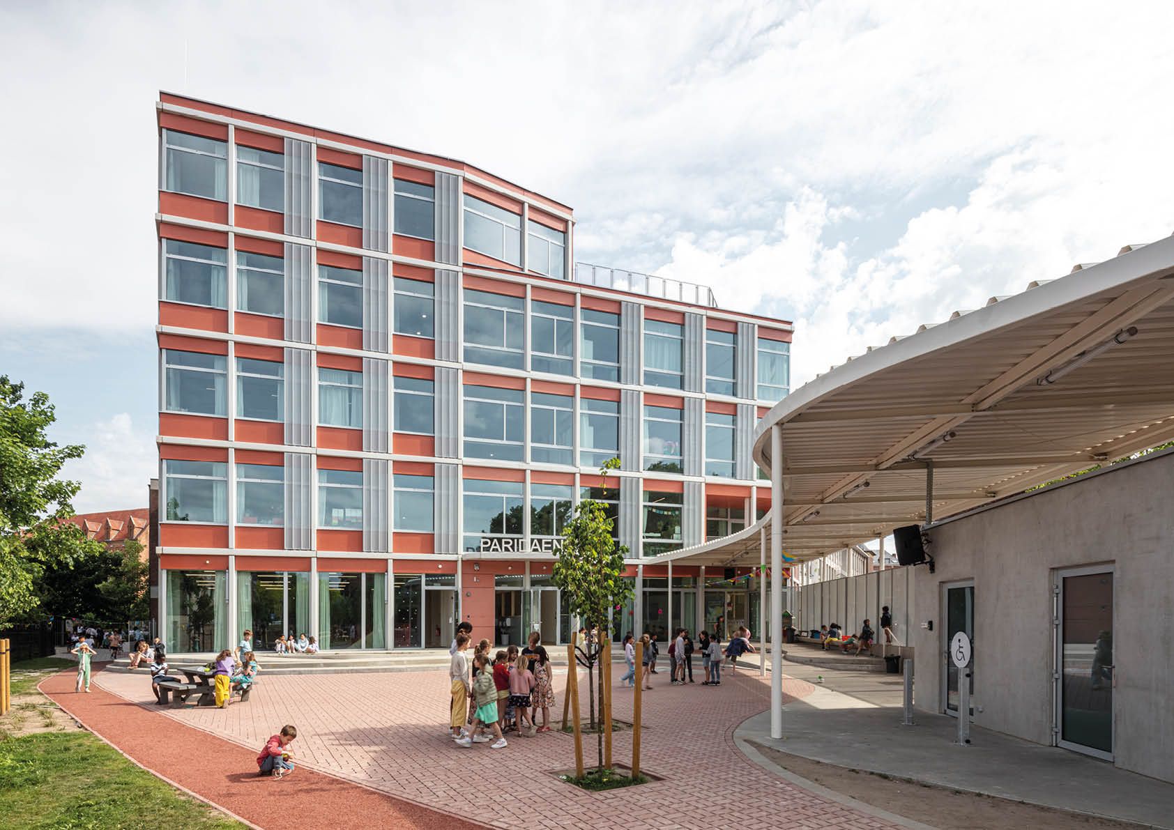 La réalisation de la nouvelle aile de l'Institut Paridaens constituait la dernière phase d’un masterplan global. Cela a donné au campus un aspect proéminent dans la ville, en tant que repère visuel et orientationnel. Un grand auvent aux formes fluides a été fixé aux structures existantes et complète le tableau.