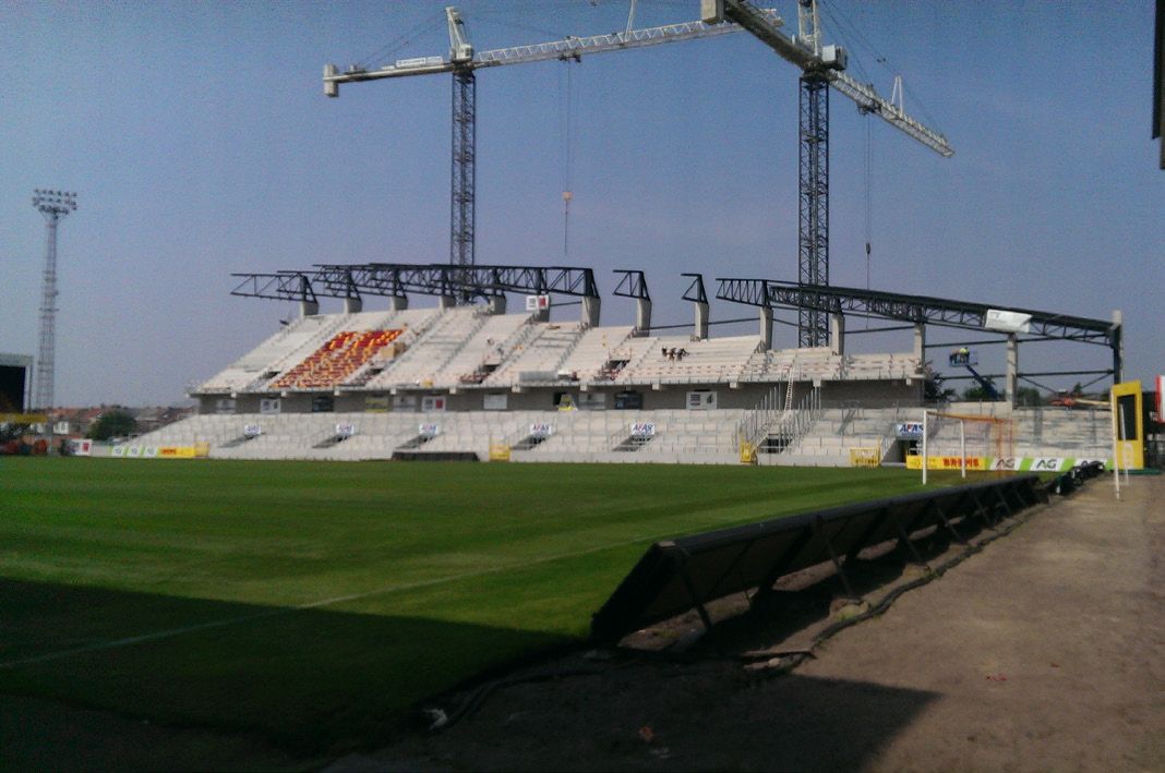 Pour l’aménagement du stade rénové du club de football KV Mechelen, différents éléments en acier ont été utilisés : la charpente de protection des tribunes (300 tonnes), les garde-corps/balustrades de 940 mètres courants), les escaliers (50 tonnes) et la structure de la façade. La charpente de protection a été réalisée au moyen de fermes métalliques en acier de 32 mètres environ. La façade arrière est constituée de panneaux sandwich en acier contre des traverses murales situées à l’arrière.