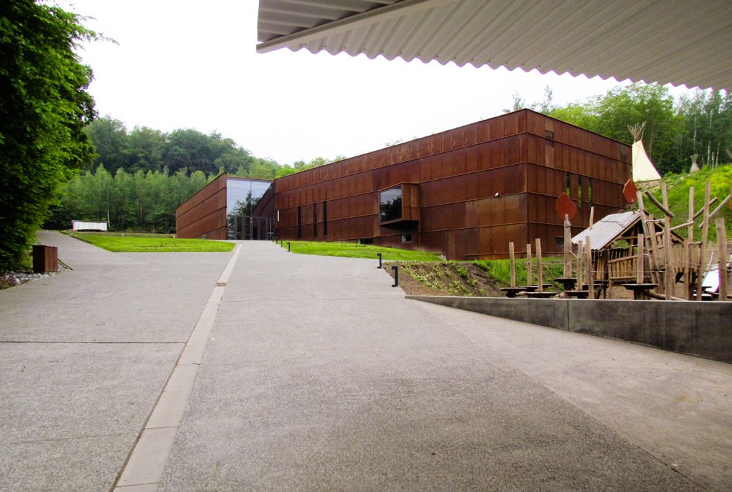 L’architecte a souhaité limiter l’emprise au sol du nouveau programme. Il a donc conservé la « maison » initiale en l’intégrant dans le volume général développé longitudinalement. Le foyer prend place en bordure du site. Il constitue une clôture transparente, immergée dans le paysage. Les matériaux choisis sont bruts : bois, auto-patinable (‘corten’), terre. L’acier auto-patinable s’intègre très bien dans l’environnement boisé. Il est à la fois mat et lumineux.