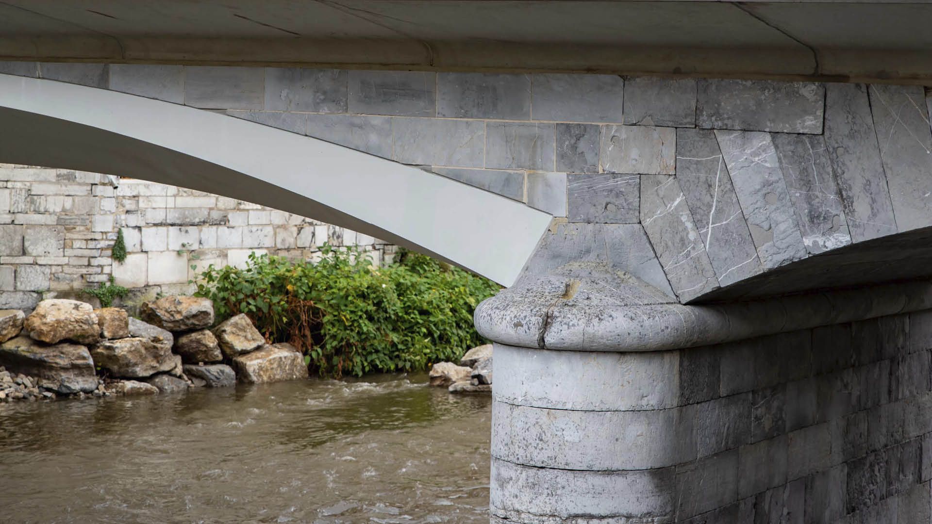 L’intervention très lourde opérée sur ce pont se veut comme un geste de mémoire de cet évènement dramatique : la pile centrale n’est pas reconstruite mais remplacée par un caisson métallique ‘pontant’ les 2 arches disparues augmentant ainsi la section hydraulique. Les deux arches restantes en maçonnerie sont conservées et maintenues.