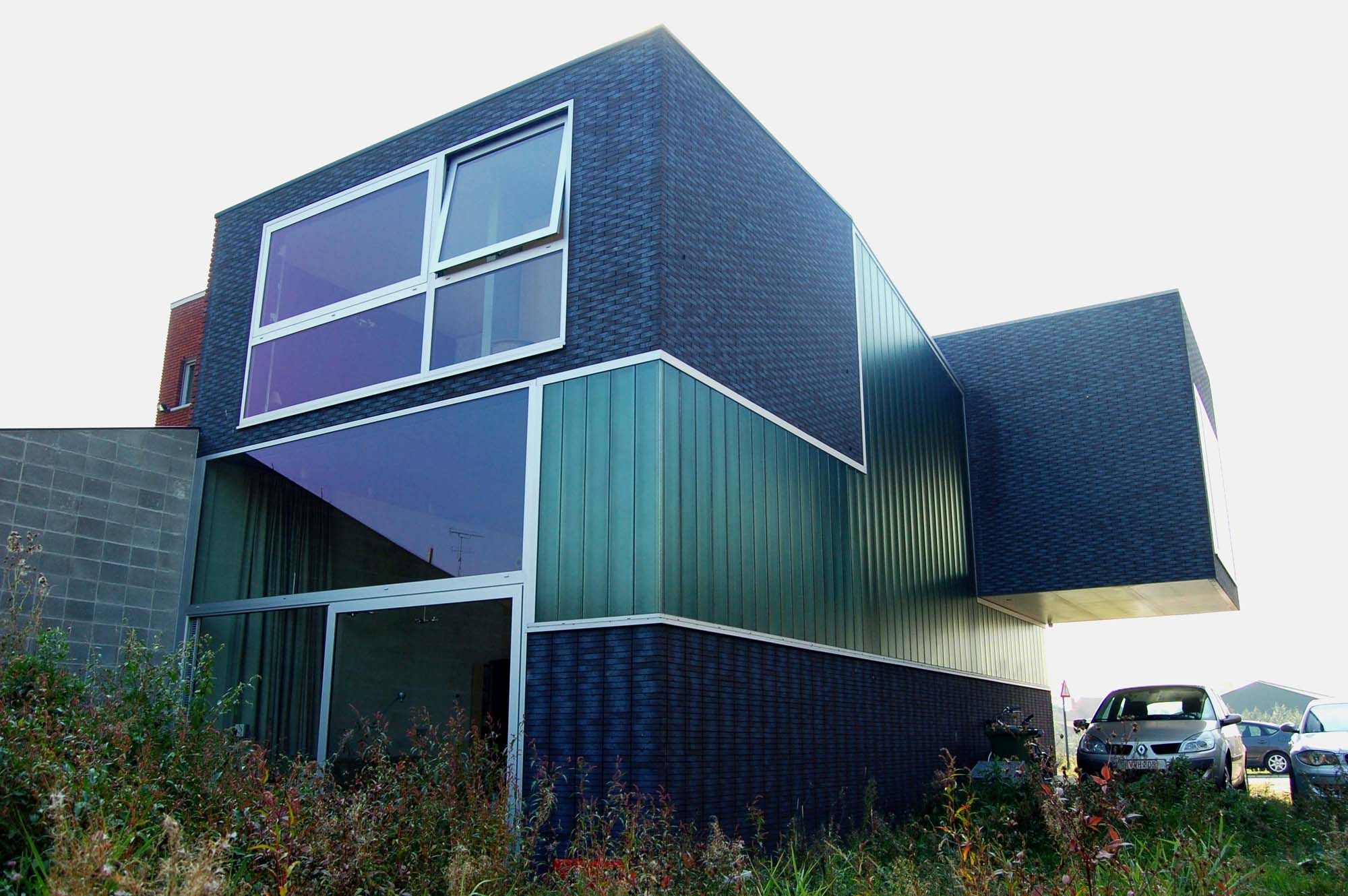 L’habitation se situe à la limite entre habitat et pâturages. Un château d’eau aux allures de soucoupe volante semble survoler l’ensemble. L’habitation est orientée à la fois vers le jardin et vers le paysage en façade. L’étage supérieur en surplomb, crée un espace permettant de mettre la voiture à l’abri. Pas de garage donc, ni d’emplacement de parking couvert classique. Par référence au tableau ‘La Tentation de Saint-Antoine’ illustrant l’aspiration à rendre les objets lourds bien plus légers, deux caisses en briques reposent à l’étage sur des pieds en acier. D’autres éléments, tels que l’armoire du vestiaire, la passerelle en dalles vitrées, l’escalier extérieur en surplomb dans le patio et la totalité de l’étage du volume avant cherchent à échapper à la pesanteur pour suggérer une impression de légèreté.