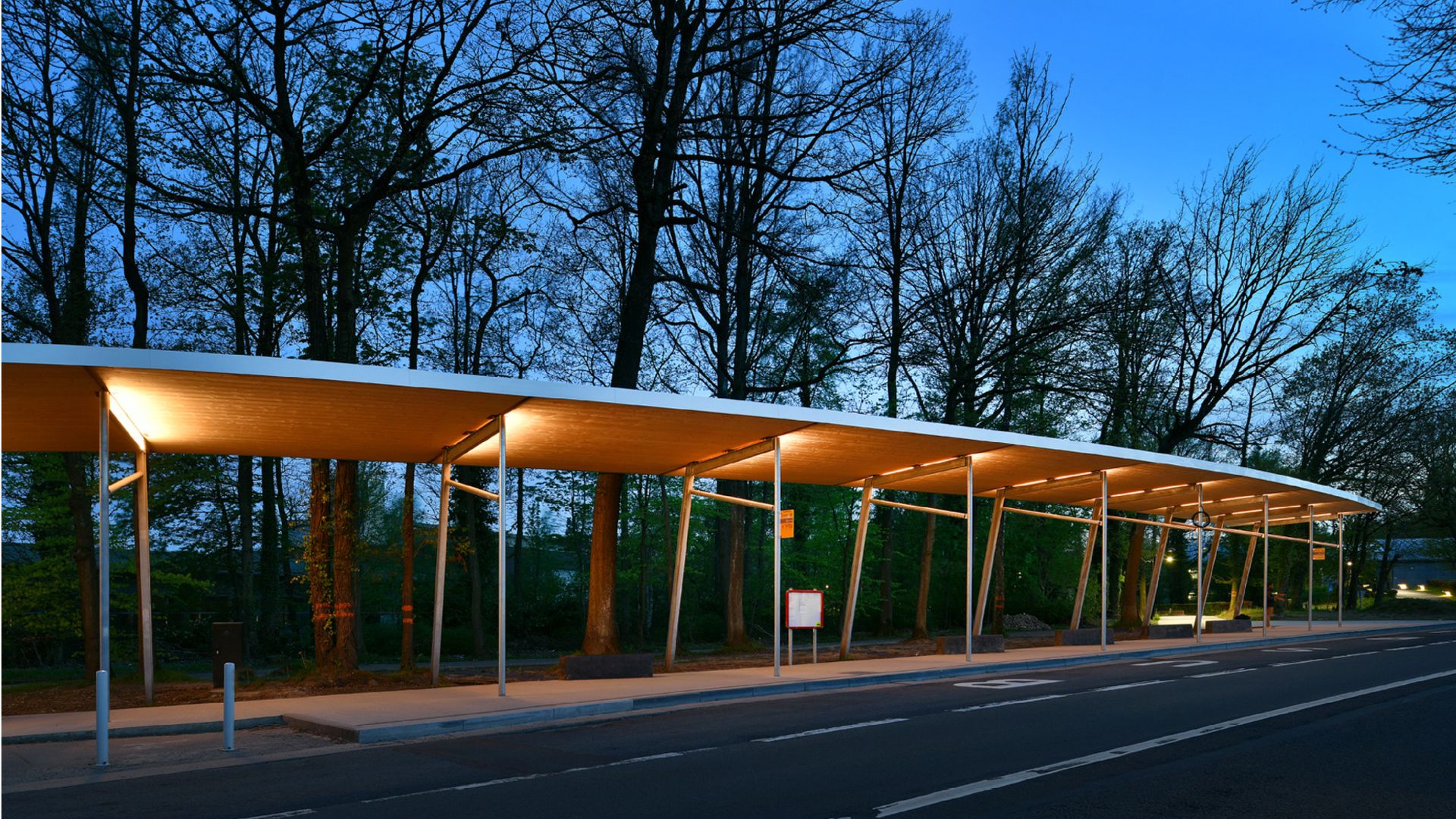 Le signal caractérisant l’intervention est le grand préau qui remplace les abris-bus dessinés par Claude Strebelle dans les années 1960. Sa structure se développe suivant 11 portiques métalliques en profilés IPE200 repris, dans leur partie avant, par des colonnes circulaires (tubes 101,6 x 5mm) afin d’allier simplicité, élégance et efficacité. La couverture plate d’un seul versant est assurée par des panneaux de CLT coplanaires couverts d’une étanchéité.Le plan en forme de banane s’inscrit dans le tracé souple des cheminements piétons qui ondulent entre les chênes existants. Le préau abrite des bancs en béton noir dessinés suivant une géométrie dynamique.