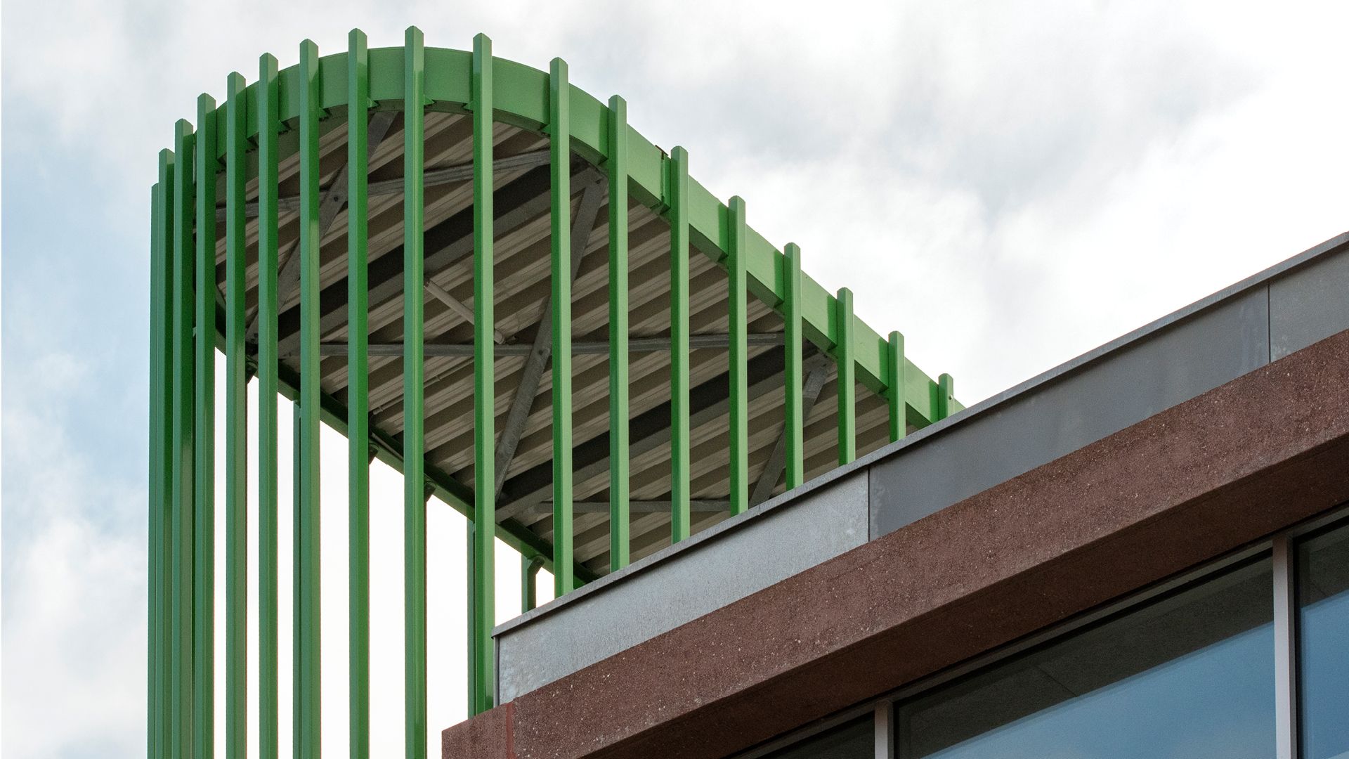 Les passerelles en porte-à-faux en acier ont été boulonnées aux colonnes en béton, créant ainsi un lien entre les différentes parties de l'école et offrant une conception ouverte et accessible. Les cages d'escalier autoportantes des deux côtés du bâtiment, faites de tubes d'acier vert, intègrent visiblement les techniques dans la conception, permettant au bâtiment de servir de matériel pédagogique. Ces structures en acier favorisent l'efficacité énergétique, la flexibilité et l'intégration esthétique dans l'environnement.
