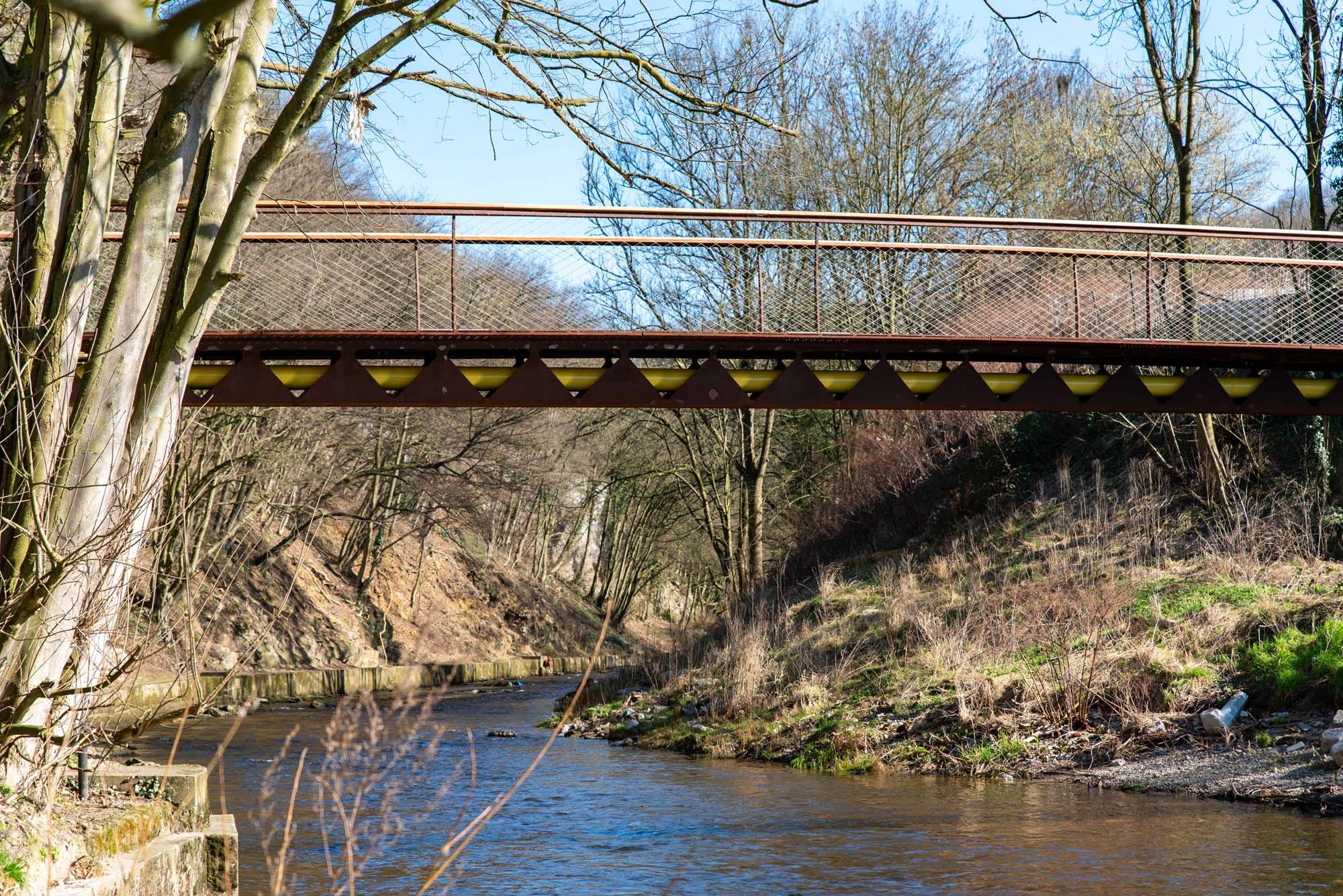 Emportée par la crue de juillet 2021, la passerelle dite du Fil de Fer (3ème du nom) à Verviers permet le franchissement de la Vesdre à un réseau de distribution de gaz. Ce projet profite de l’opportunité d’une infrastructure à première vocation technique (supporter des réseaux impétrants) pour concevoir une passerelle permettant un usage fonctionnel à disposition du public. Cet ouvrage supporte un réseau de gaz naturel et rétablit une nouvelle connexion piétonne entre les 2 berges de la Vesdre. D’une portée de 21m, elle s’appuie sur les culées existantes restaurées des précédents ouvrages. Le premier ouvrage de 1825 avait été emporté par grande la crue de 1850 et reconstruit en 1865. La structure, en acier auto-patinable d’un poids de seulement 3,8 tonnes, est composée d’une section ouverte en forme de U perforée d’ouvertures triangulaires accueillant la conduite de gaz. La passerelle est conçue pour permettre une connexion piétonne entre les rives par l’ajout d’un platelage en bois et d’escaliers d’accès. La passerelle entièrement préfabriquée en atelier a été installée déjà équipée de la conduite de gaz, du platelage en bois et des garde-corps limitant ainsi au strict minimum les interventions sur chantier. De plus, aucun appareil d’appui n’est prévu. Sur une rive, une simple tôle verticale assure l’appui et la dilatation de l’ouvrage. Sur l’autre rive, un point fixe est créé par 2 tôles formant une triangulation