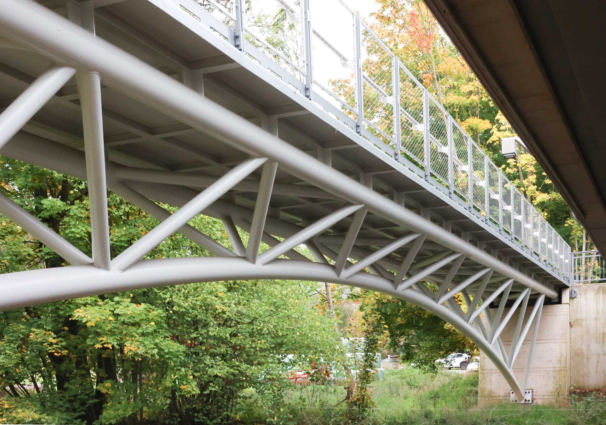 Dans le cadre de la rénovation du pont OA318 sur la N12 enjambant l’Attert à Reichlange (Redange-sur-Attert), une nouvelle passerelle cycliste et piétonne est créée à côté de l’ouvrage existant. Cette passerelle métallique a une portée de 36,22 m. La structure portante est un treillis tridimensionnel entièrement soudé d’atelier et constitué de 3 tubes D273 longitudinaux, complétés de diagonales et traverses en tubes D139,7. Le platelage, d’une largeur de 3 m est constitué d’une poutraison longitudinale et transversale en HEA100 et de tôles d’épaisseur 8 mm, le tout entièrement soudé sur la structure portante. La structure portante tubulaire est réalisée en acier S355 tandis que le platelage est réalisé en acier S235JR. L’ensemble de l’ouvrage métallique a un poids de 24 tonnes. Un garde-corps composé de cadres tubulaires avec un remplissage en filet X-Tend, le tout en inox 316, équipe les 2 côtés du platelage. Un revêtement époxy-polyuréthane est appliqué sur l’entièreté de cette surface. La structure métallique a entièrement été assemblée et soudée en atelier, et ce, en 3 temps. La structure a été entièrement sablée, métallisée et peinte, en une pièce, en atelier, suivant le système anti-corrosion ZTV-ING 4-3 (pour une classe de corrosivité C5).