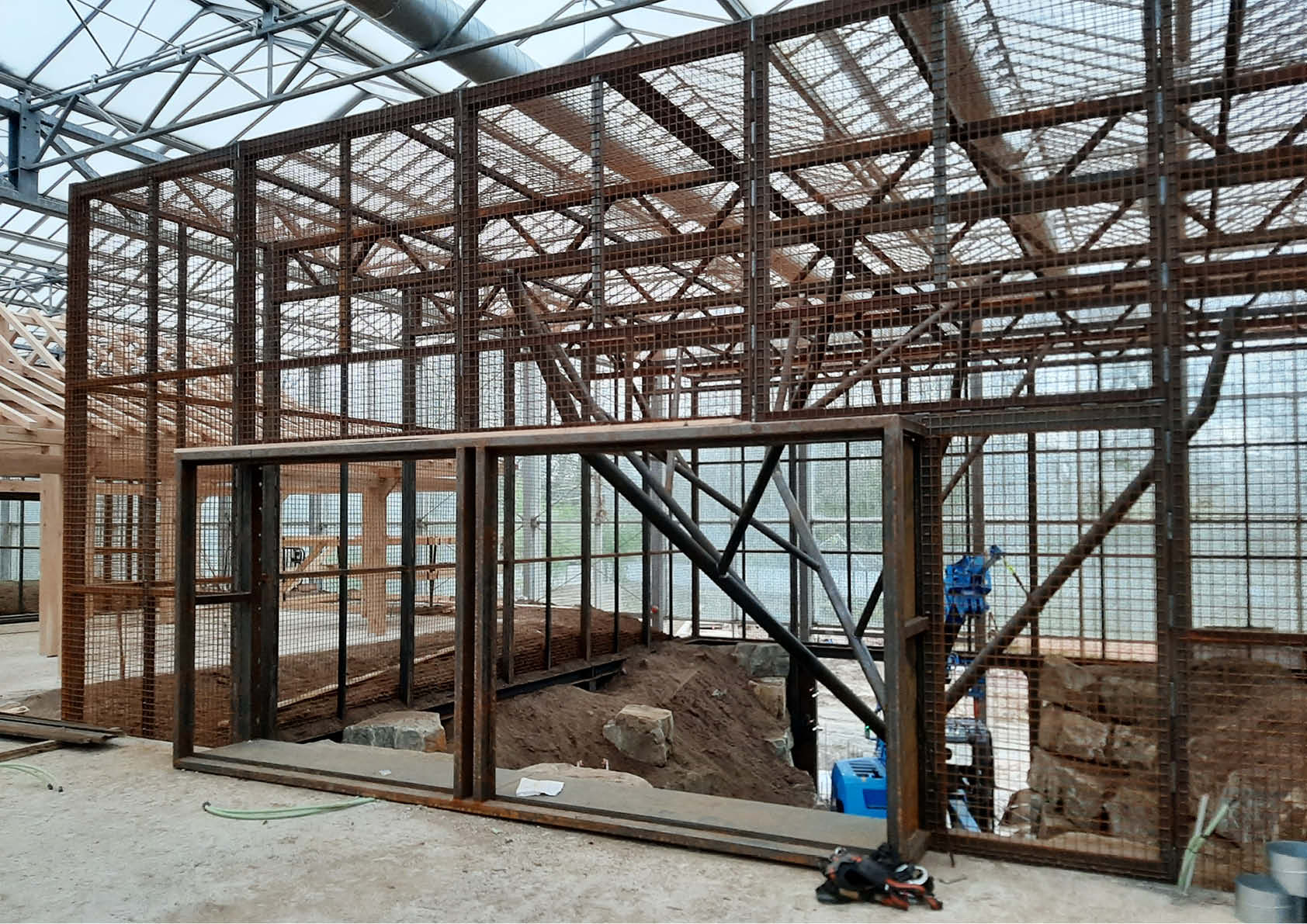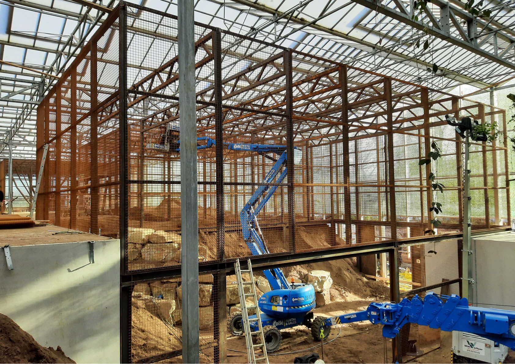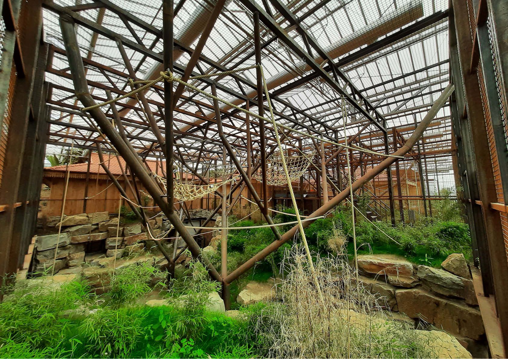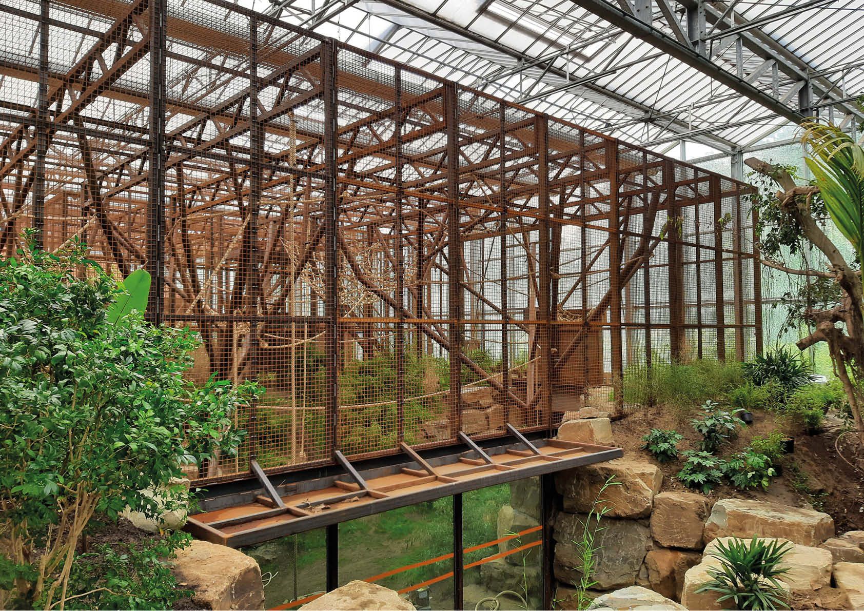 Drie metalen kooien, vijf metalen bomen, drie gemotoriseerde poorten en achter de schermen ook nog zeven betonnen kooien met rvs-traliewanden en poorten: de orang-oetangs in Planckendael kregen een kwalitatieve nieuwe verblijfplaats. Deze werd opgebouwd in een bestaande serre van 100 x 100 meter, met een hoogte van 9 meter. Een metalen ringbalk fungeert als basis voor kaders van 2 meter breed en 5 meter hoog met stalen netten, die goed zijn voor een totaalgewicht van 11 ton. De dakligger is een vakwerk, bestaande uit 100x100x5- en 60x60x3-kokers: sterk genoeg voor een overspanning van 12 meter en een slingerende aap van 150 kilo.